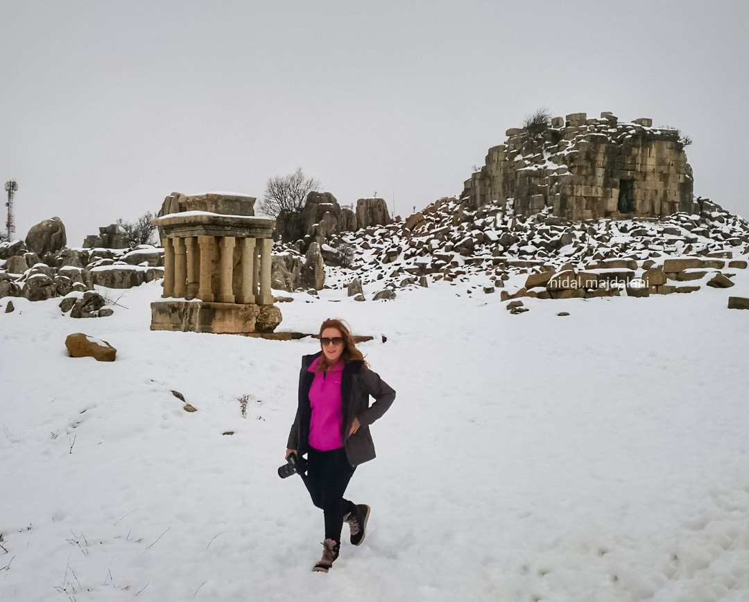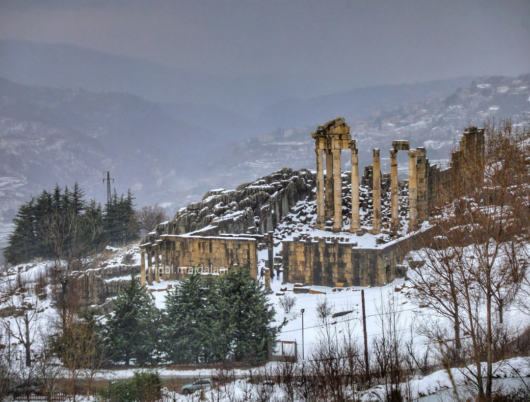 على يمينكم يستقبلكم المعبد الروماني المؤلف من ستة أعمدة على الطراز الكورنثي، ويحوي مخطوطتين يونانيتين على بابه الرئيسي ويميناً على حجر الزاوية, ويُذكر أنه شُيّد سنة 43. وهو معبد مُسيّج ومحمي عكس الآثار الموجودة على شمال الطريق والتي تقتضي حمايتها أيضاً. وهي مؤلفة من معبد من طابقين على شكل المربّع ومزار من اثني عشر عموداً ومذبح، كما ترون في لقطًاتي.