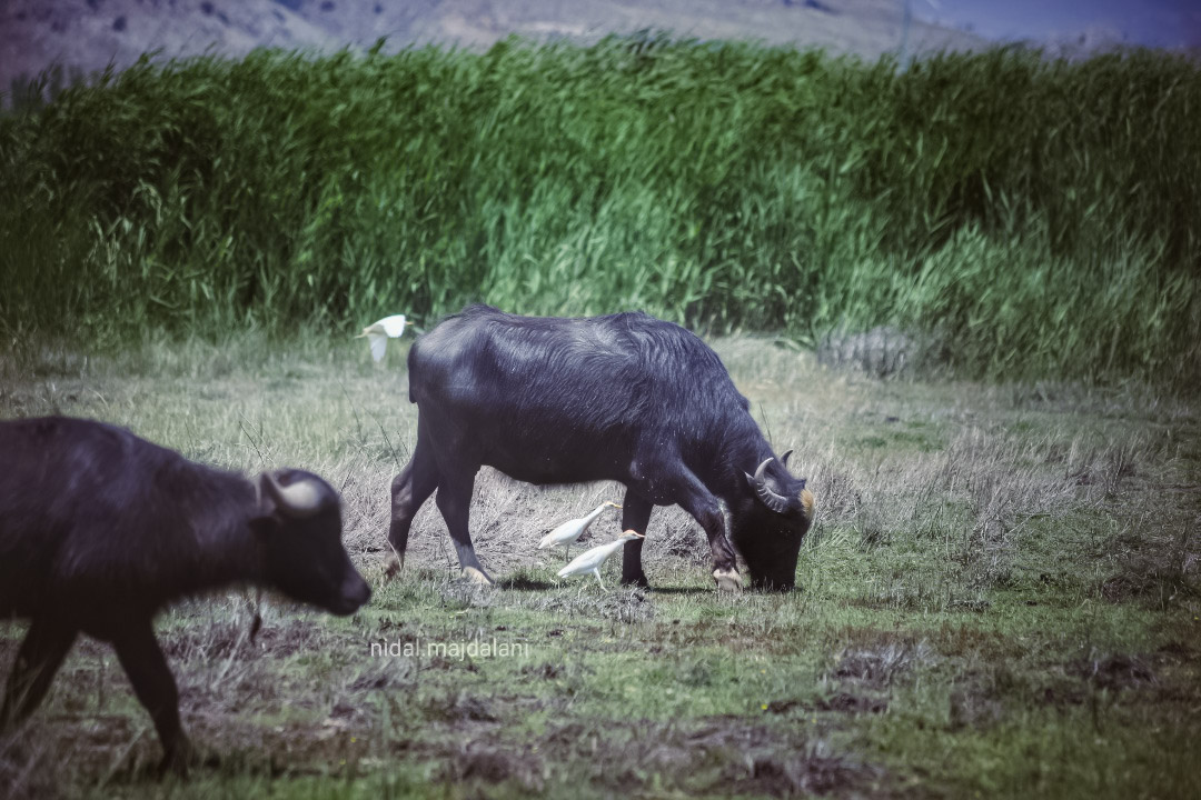 وهنا مجموعة من الجواميس التي ترعى في هذه الأرض وتسبح في مياهها كلما اشتد الحر، وهي ذات علاقة متميزة مع طيور اللقلق.