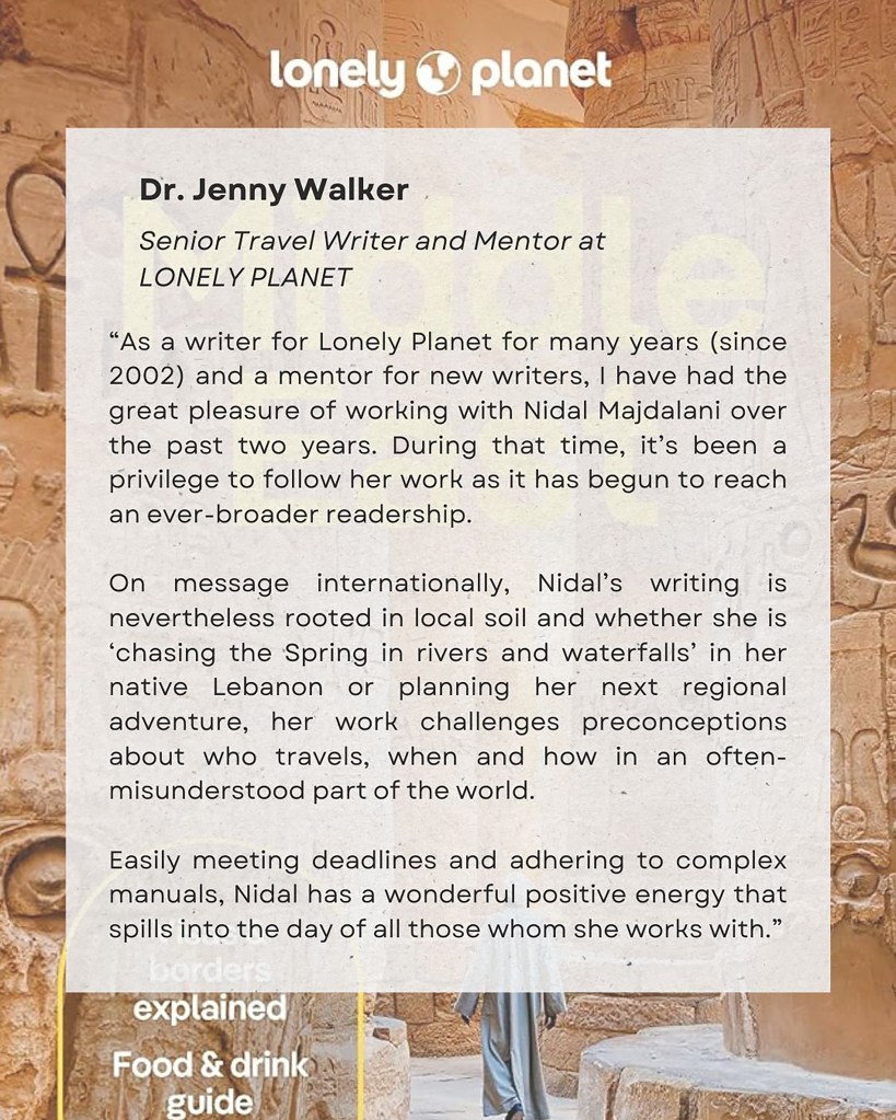 For someone who long avoided interviews and the spotlight, being approached by Lonely Planet and becoming the first Lebanese to write about her homeland is proof that true and authentic voices will eventually be appreciated.