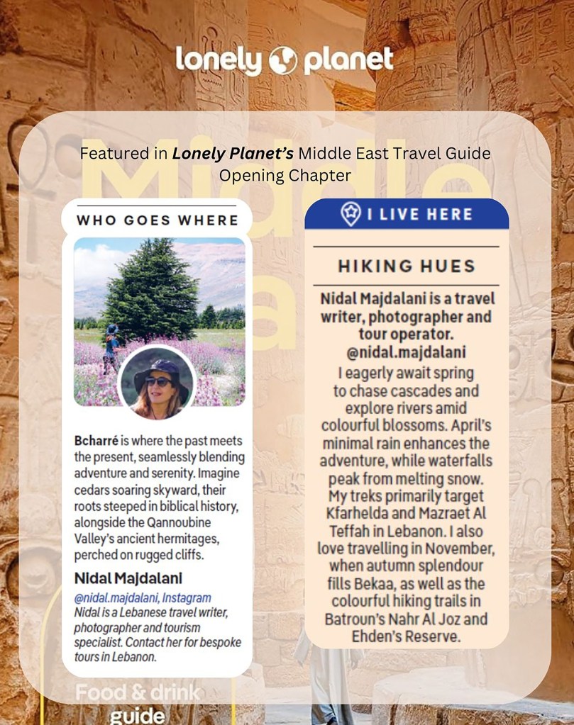 One of the most meaningful surprises was being featured on the very first page of the book, under “Who Goes Where”, and again in the “I Live Here” section, where I shared thoughts on exploring Lebanon during the shoulder seasons. I was also happy to see several of my own photographs included throughout the chapter.